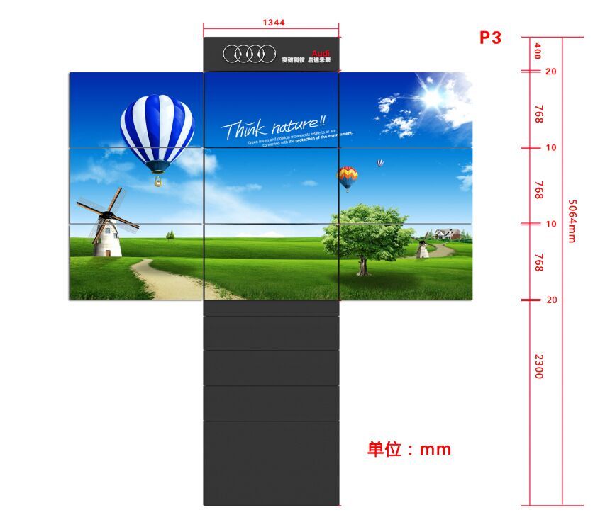 LED旋轉(zhuǎn)屏以靈活多變的旋轉(zhuǎn)姿態(tài)吸引著人們的注意,其結(jié)構(gòu)整體為三角柱體形狀,中間視頻顯示部分由三層三角形LED箱體構(gòu)成。在旋轉(zhuǎn)系統(tǒng)的控制下,三個(gè)LED屏體相互配合,旋轉(zhuǎn)動(dòng)作與視頻畫面協(xié)調(diào)運(yùn)作,三面共九個(gè)小LED顯示屏可單獨(dú)播放視頻,也可拼接為三個(gè)視頻或?qū)⑷嫒龑覮ED拼接為一個(gè)整體視頻播放。動(dòng)態(tài)屏幕與視頻畫面完美結(jié)合,為人們帶來(lái)震撼的視覺沖擊力,進(jìn)而促進(jìn)投放戶外廣告的有效傳播。