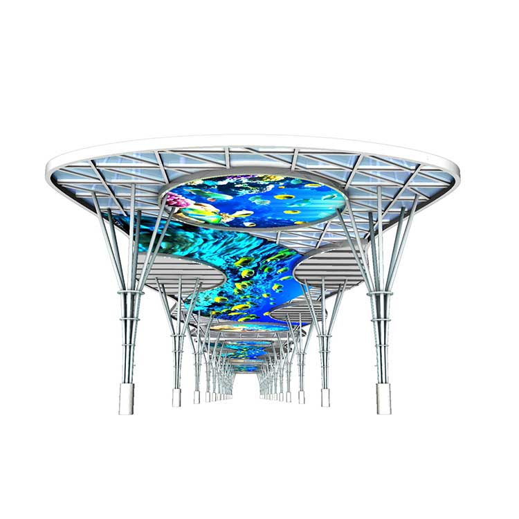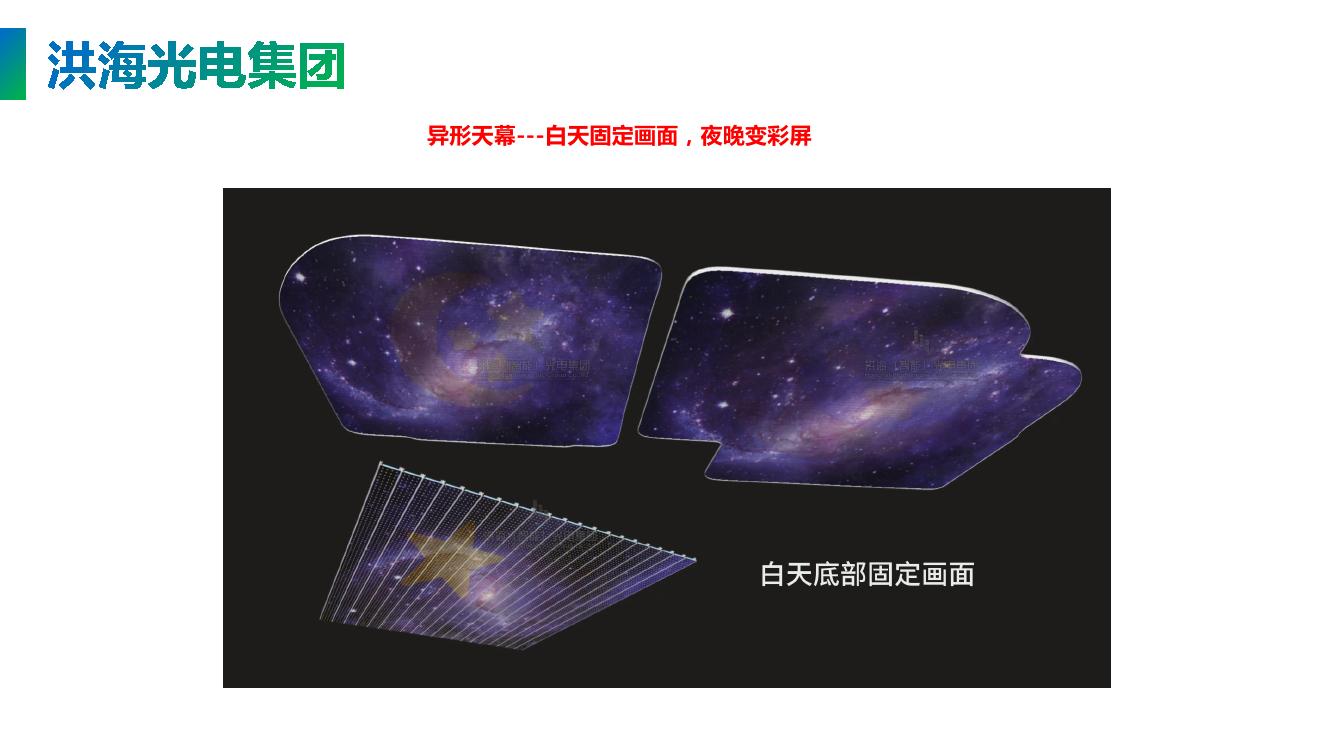 洪海LED天幕(彩色矩陣天幕)以其弧形式的設計占據整片外墻,蜿蜒起伏,白天具有很好的格柵裝飾效果,到了傍晚LED點亮,以其磅礴的視頻展現多彩的世界,在渲染商業地產氛圍的同時,聚集人氣提高商業地產的價值。