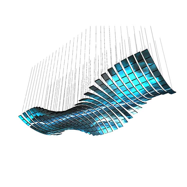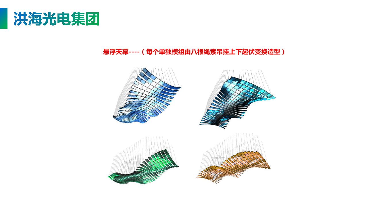 懸浮天幕----每個(gè)單獨(dú)模組由八根繩索吊掛上下起伏變換造型